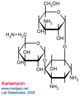 კანამიცინი. Kanamycin. ქიმიური დასახელება – 0-3-ამინო-3-დეზოქსი-ალფა-D-გლუკოპირანოზილ -(1″6)-0-[6-ამინო-6-დეზოქსი-ალფა-D-გლუკოპირინაზილ -[1″4)]-2-დეზოქსი-D-სტრაპტამინა (სულფატის სახით). ბრუტო–ფორმულა:C18H36N4O11. კანამიცინს მიაკუთვნებენ ამინოგლიკოზიდების ჯგუფს. CAS-კოდი:59-01-8 .