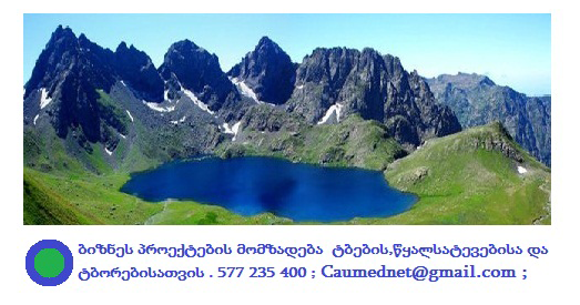 MTVI agency მრავალი წელია წამატებით მუშაობს ბიზნეს-გეგმების მომზადებასა და ბიზნესების დაპროექტებაზე. საქართველოსათვის ერთ-ერთი პერსპექტიული ბიზნესი ჩვენი ტბები და წყალსაცავებია. ტბების, წყალსაცავების, ტბორების მეპატრონეებს ვთავაზობთ ბიზნეს-გეგმების მომზადებას გრანტების, შეღავათიანი კრედიტების, ჩვეულებრივი კრედიტებისა თუ ინვესტორთა ძიებისათვის 577 235 400, Caumednet@gmaul.com; skype-medgeo.net