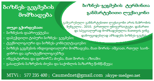 გადასვლები: ბიზნეს-გეგმების სათაო გვერდზე >>> ლევან შენგელიას სახელმძღვანელოებზე >>> ბიზნეს-გეგმების განმარტებითი ლექსიკონის სათაო გვერდზე >>>