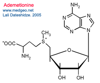 ადემეთიონინი. Ademetionine. ქიმიური დასახელება – ( (S)-5′-[(3-ამინო-3-კარბოქსიპროპილ)მეთილსულფონიო]-5-დეზოქსიადენოზინ ჰიდროქსიდი (შიგნითა მარილი) (და დისულფატ დი-პ-ტოლუოლსულფონატის სახით). ბრუტო–ფორმულა:C15H22N6O5S. ადემეთიონინს მიაკუთვნებენ ანტიდეპრესანტების ჯგუფს. CAS-კოდი:29908-03-0.