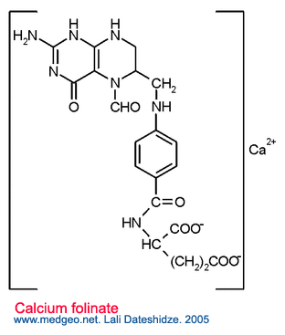 კალციუმის ფოლინატი. Calcium folinate. ქიმიური დასახელება – კალციუმის მარილიN-[4-[[(2-ამინო-5-ფორმილ -1,4,5,6,7,8-ჰექსაჰიდრო -4-ოქსო-6-პტერიდინილ)მეთილ]ამინო]ბენზოილ]-L-გლუტ ამინის მჟავა (და პენტაჰიდრატის მარილის სახით). ბრუტო–ფორმულა:C20H21CaN7O7. კალციუმის ფოლინატს მიაკუთვნებენ დეტოქსიკაციის საშუალებების ჯგუფს ანტიდოტების ჩათვლით . CAS-კოდი:1492-18-8.