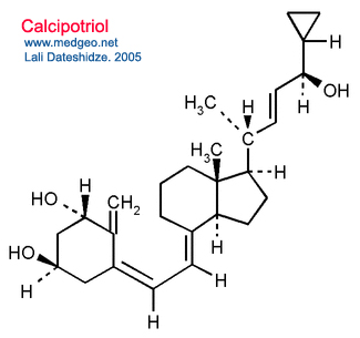 კალციპოტრიოლი. Calcipotriol. ქიმიური დასახელება – (5Z,7E,22E,24S)-24- (5Z,7E,22E,24S)-24-ციკლოპროპილ-9,10-სეკოქოლა-5,7,10(19),22- ტეტრაენ-1-ალფა,3ბეტა,24-ტრიოლი. ბრუტო–ფორმულა:C27H40O3. კალციპოტრიოლს მიაკუთვნებენ დერმატროპული საშუალებების ჯგუფს. CAS-კოდი:112965-21-6.