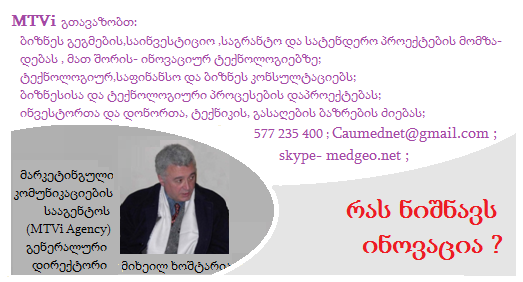 საგრანტო და შეღავათიანი კრედიტების პროგრამები ითხოვენ ბიზნეს გეგმები იყოს ინოვაციური. MTVi agency (577 235 400, Caumednet@gmail.com) გთავაზობთ ინოვაციური, საავტორო ბიზნეს გეგმების მომზადებას, როგორც რეგიონალურ, ასევე დარგობრივ ჭრილში. ამ გვერდზე ჩვენ შევკრიბეთ განმარტებები, რომლებიც ტერმინს „ინოვაცია“ ეხება.